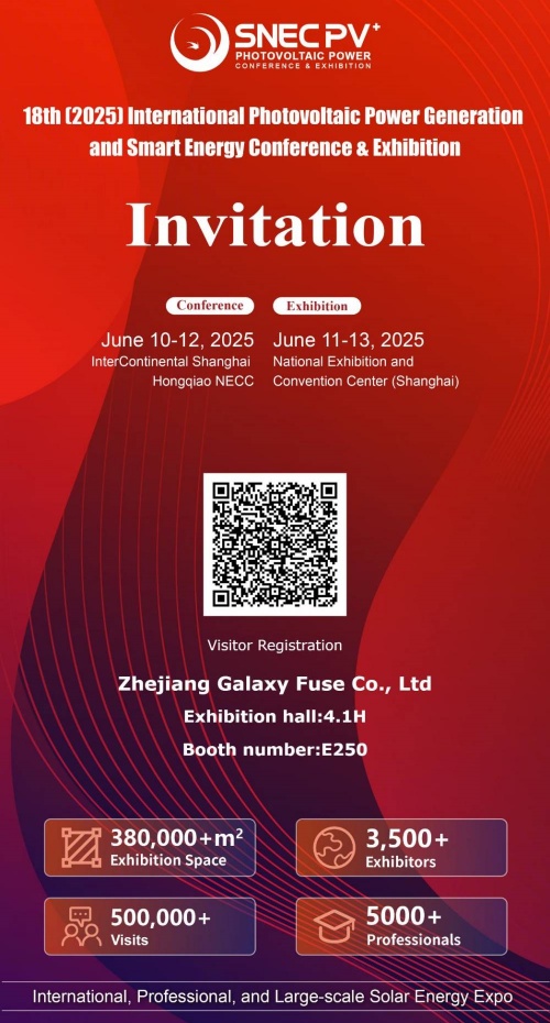 మేము దానిని ప్రకటించినందుకు సంతోషిస్తున్నాముజెజియాంగ్ గెలాక్సీ ఫ్యూజ్ కో., లిమిటెడ్. రాబోయే వద్ద ప్రదర్శించనున్నారు18 వ (2025) అంతర్జాతీయ కాంతివిపీడన విద్యుత్ ఉత్పత్తి మరియు స్మార్ట్ ఎనర్జీ కాన్ఫరెన్స్ & ఎగ్జిబిషన్ (SNEC PV+ 2025)షాంఘైలో. కాంతివిపీడన మరియు కొత్త ఇంధన రంగాలలో ఒక ప్రధాన వార్షిక కార్యక్రమంగా, SNEC PV+ పరిశ్రమ పోకడలను చర్చించడానికి మరియు తాజా సాంకేతికతలు మరియు ఉత్పత్తులను ప్రదర్శించడానికి ప్రముఖ ప్రపంచ సంస్థలు మరియు నిపుణులను ఒకచోట చేర్చింది.